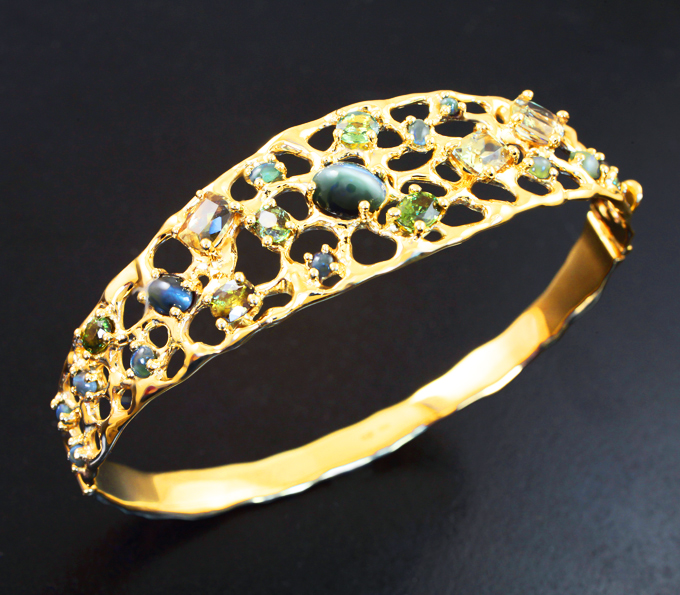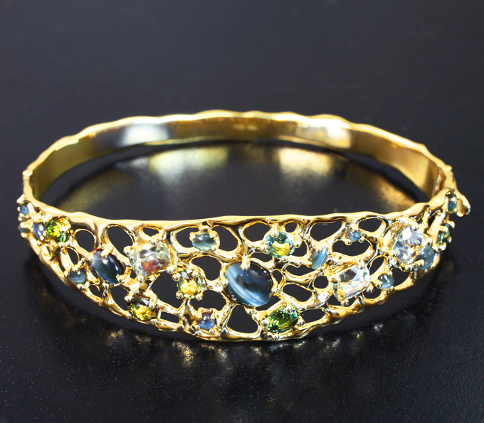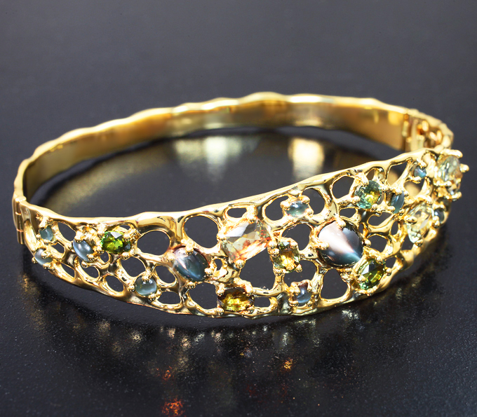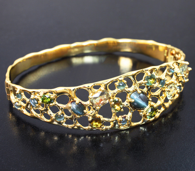 Вашему вниманию предлагается браслет из желтого золота 585 пробы с хризобериллом с эффектом кошачьего глаза, уральскими александритами и диаспорами! Длина браслета по внутренней окружности 180 мм, ширина 19 мм. Вес изделия 22,1 г. Ниже приводятся ювелирные характеристики вставок.