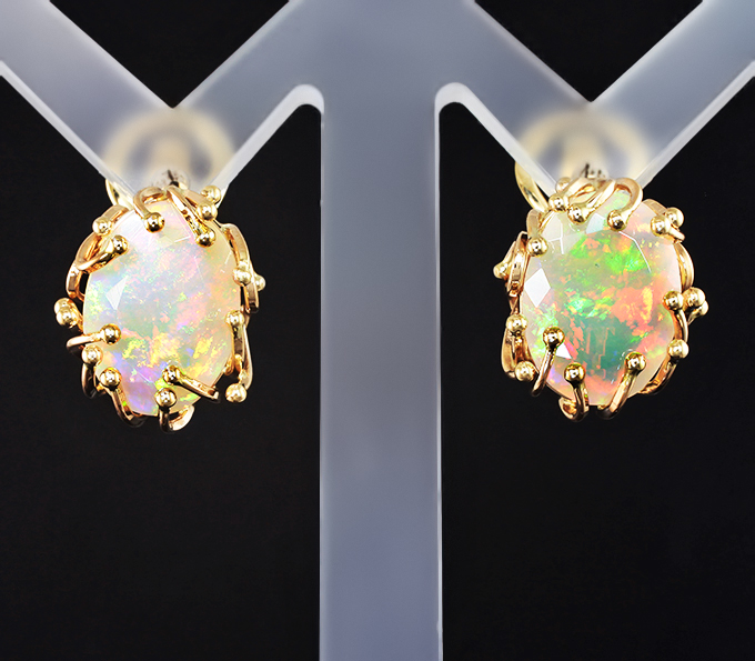 Вашему вниманию предлагаются серьги из желтого золота 585 пробы с огранеными эфиопскими опалами! Основные цвета опалесценции: красный, желтый, зеленый и фиолетовый. Площадка серег 16 х 13 мм. Вес пары 6,89 г. Ниже приводятся ювелирные характеристики вставок.