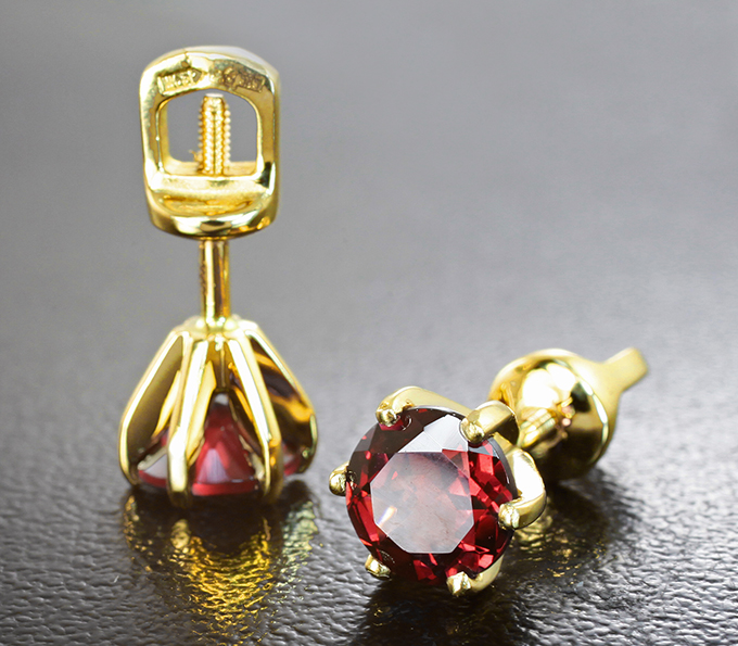Вашему вниманию предлагаются пусеты из желтого золота 585 пробы с пиропами гранатами! Диаметр пусет 7 мм. Вес пары 2,72 г. Ниже приводятся ювелирные характеристики вставок.
