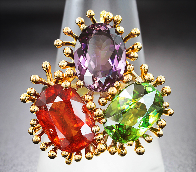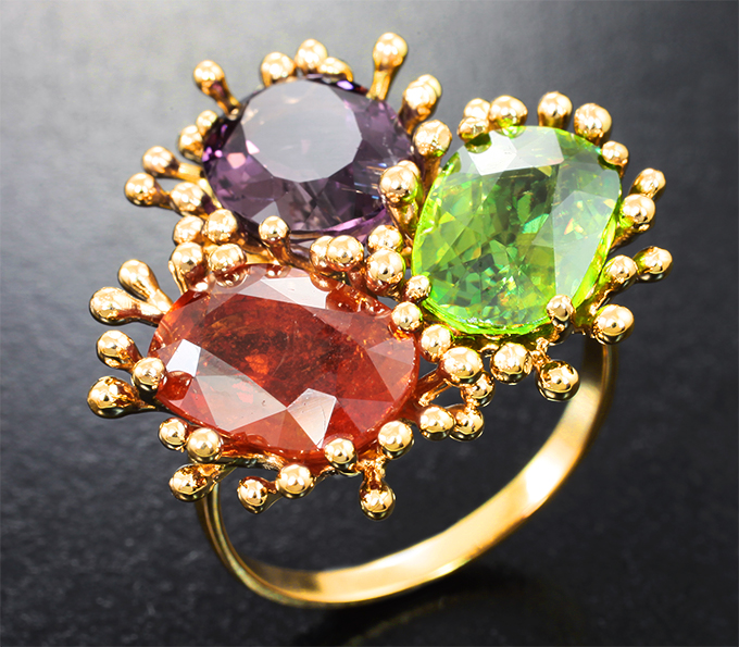 Кольцо с крупым зеленым сфеном, спессартином «фанта» и скаполитом топового цвета