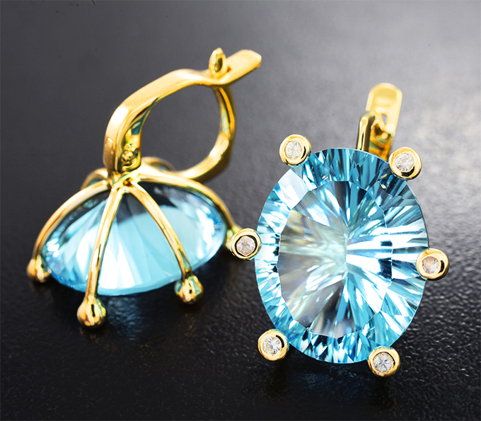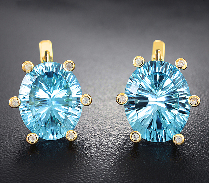 Серьги с крупными голубыми топазами лазерной огранки 28,85 карата и лейкосапфирами
