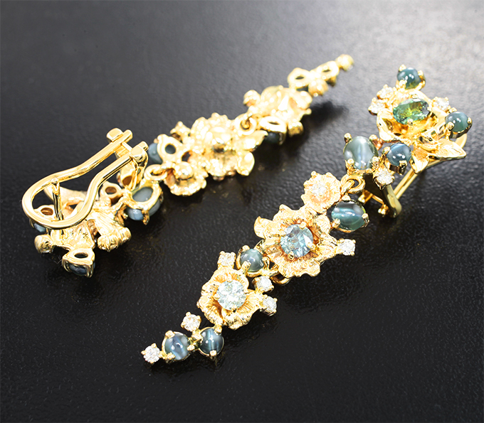 Вашему вниманию предлагаются серьги из желтого золота 585 пробы с хризобериллами с эффектом кошачьего глаза 4,36 карата, александритами 1,73 карата и бриллиантами! Размеры вставок от 2 мм до 6 х 4 мм. Площадка серег 54 х 15 мм. Вес пары 13,67 г. Ниже приводятся ювелирные характеристики вставки.