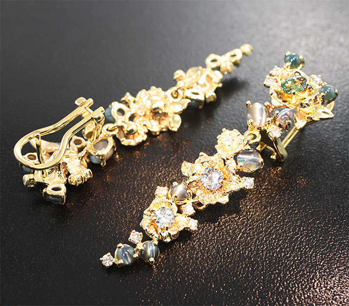 Серьги с хризобериллами с эффектом кошачьего глаза 4,36 карата, александритами 1,73 карата и бриллиантами