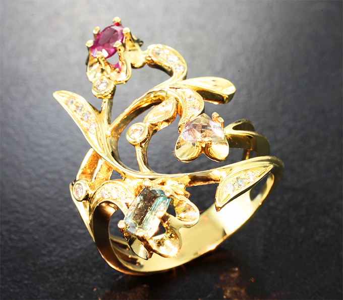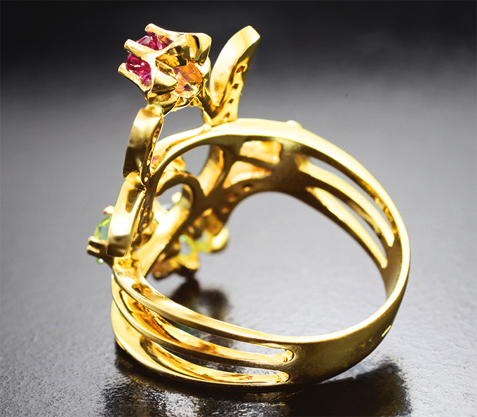 Вашему вниманию предлагается кольцо из желтого золота 585 пробы с уральскими александритами, рубином и бриллиантами! Диаметр дополнительной инкрустации 1,1 мм и 1,5 мм. Площадка 30 х 21 мм, высота 4 мм. Вес изделия 7,71 г. Размер 18,5.