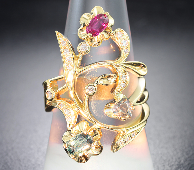 Кольцо с уральскими александритами 0,71 карата, рубином и бриллиантами