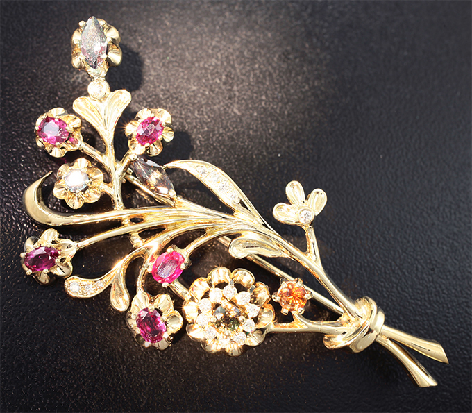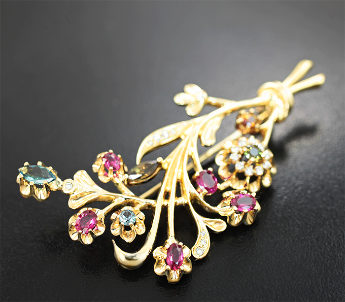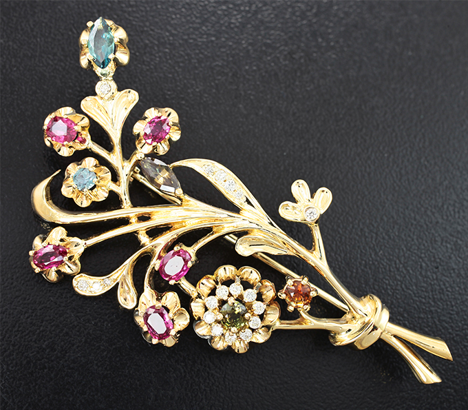 Вашему вниманию предлагается брошь из желтого золота 585 пробы с александритами, рубинами и бриллиантами! Диаметр дополнительной инкрустации 1,1 мм и 1,5 мм. Площадка 66 х 34 мм. Вес изделия 15,63 г. Ниже приводятся ювелирные характеристики вставок.