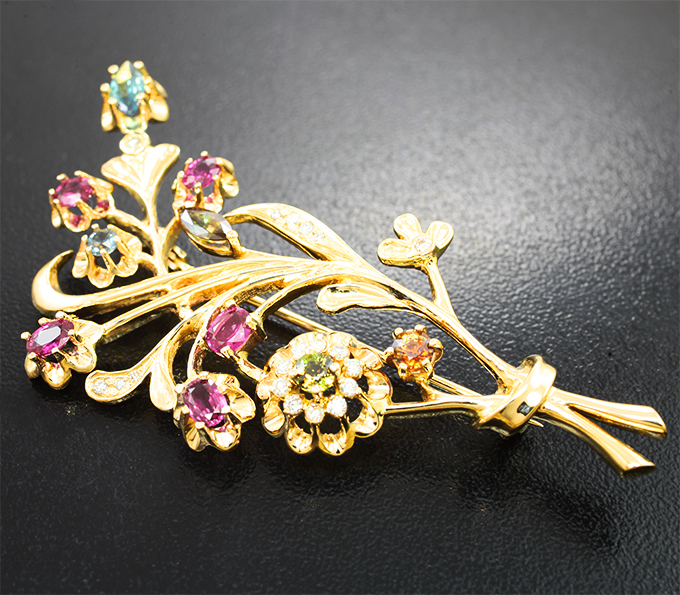 Брошь с александритами 1,44 карата, рубинами и бриллиантами