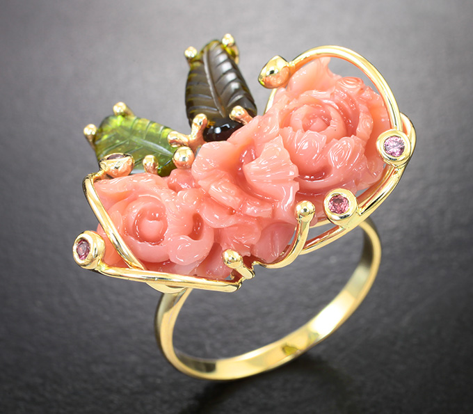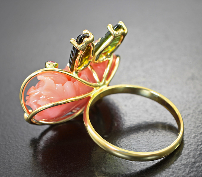 Вашему вниманию предлагается кольцо из желтого золота 585 пробы c резным solid кораллом, зеленым турмалином и сапфирами! Размеры дополнительной инкрустации 1,5 мм до 12 х 5 мм. Площадка 26 х 23 мм, высота 10 мм. Вес изделия 6,47 г. Размер 17,5. Ниже приводятся ювелирные характеристики вставки.