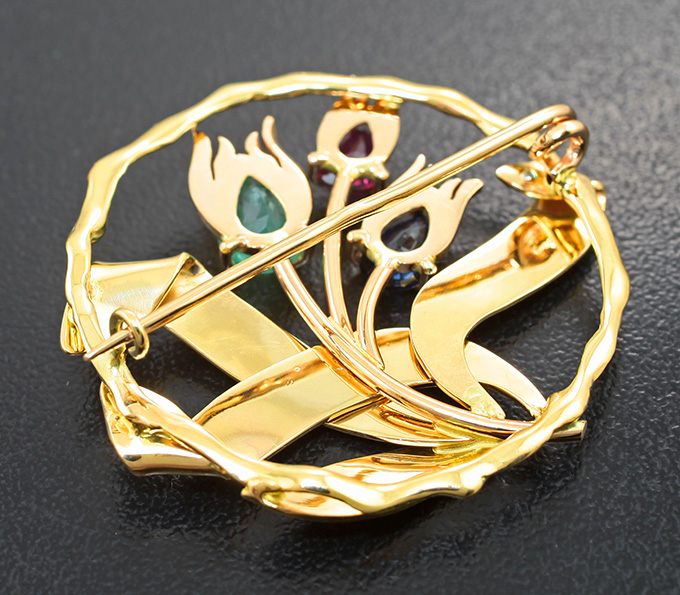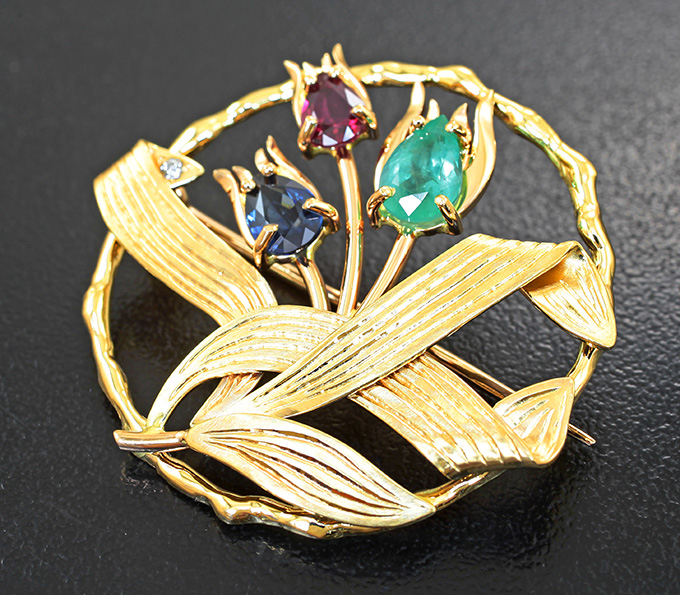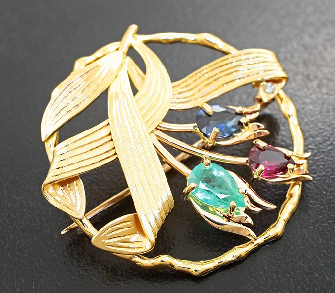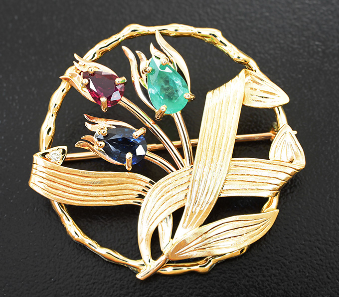 Брошь с сапфиром, рубином, изумрудом и бриллиантом