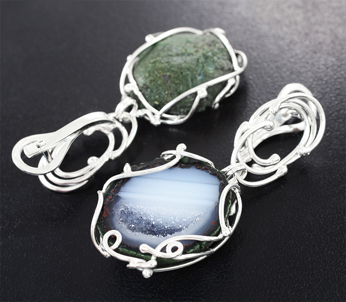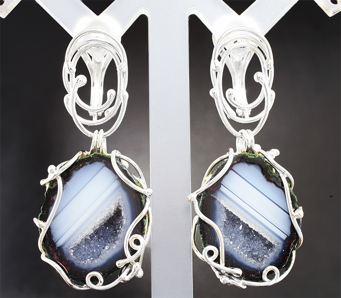 Вашему вниманию предлагаются серьги из стерлингового серебра (925 проба) с симметричными друзами агата! Размеры вставок 24 х 20 мм. Размеры серег с петлей 50 х 23 мм. Вес пары 19,98 г. Ниже приводятся ювелирные характеристики вставок.