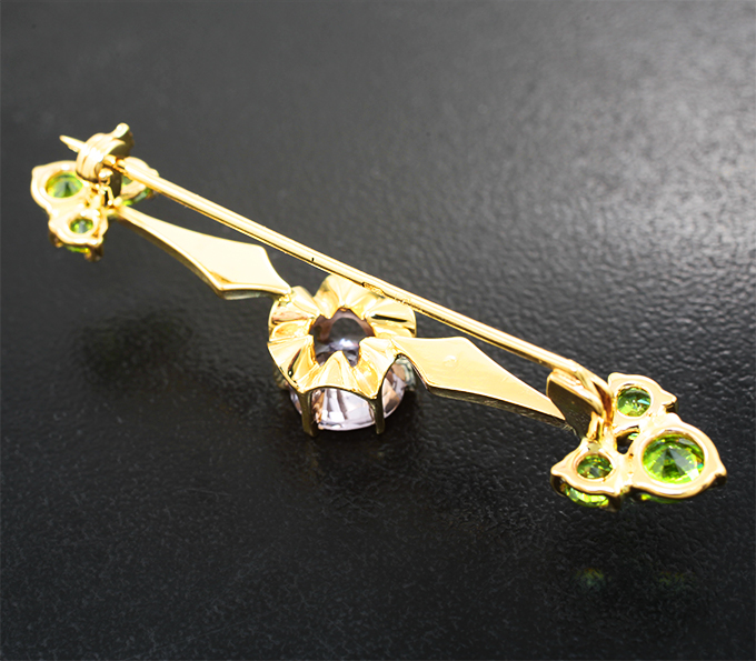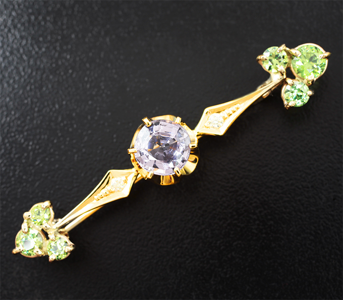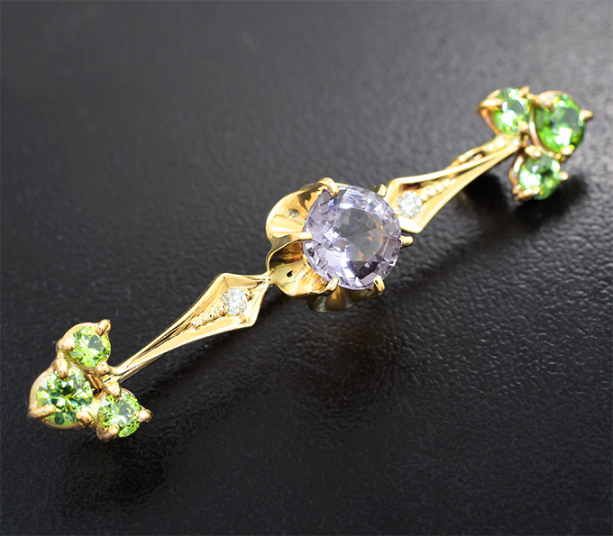 Золотая брошь с нежно-сиреневой шпинелью 1,91 карата, уральскими демантоидами 1,4 карата и бриллиантами