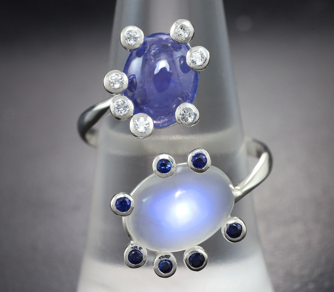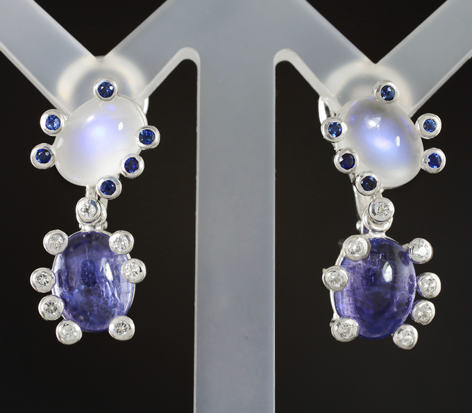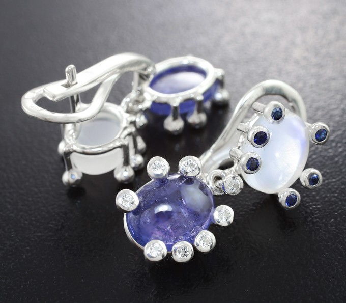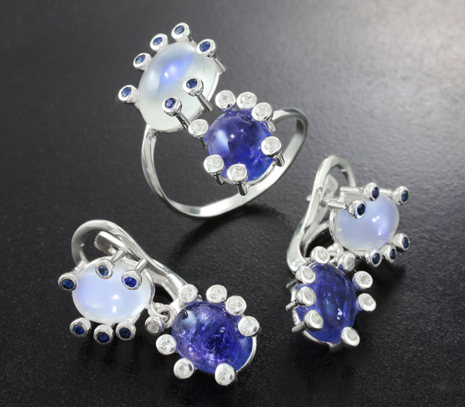 Комплект с насыщенными танзанитами 8,62 карата, лунным камнем, бесцветными топазами и синими сапфирами