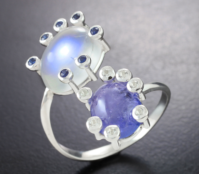 Вашему вниманию предлагается комплект (кольцо + серьги) из стерлингового серебра (925 проба) с насыщенными танзанитами, лунным камнем, бесцветными топазами и синими сапфирами! Диаметр дополнительной инкрустации 1,5 мм. Вес комплекта 11,98 г.