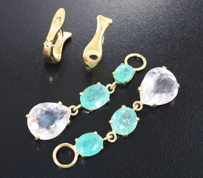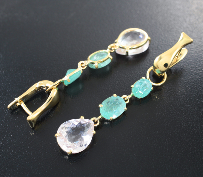 Вашему вниманию предлагаются серьги из желтого золота 585 пробы с параиба турмалинами и морганитами! Размеры серег с петлей 51 х 10 мм. Вес пары 7,85 г. Ниже приводятся ювелирные характеристики вставок.