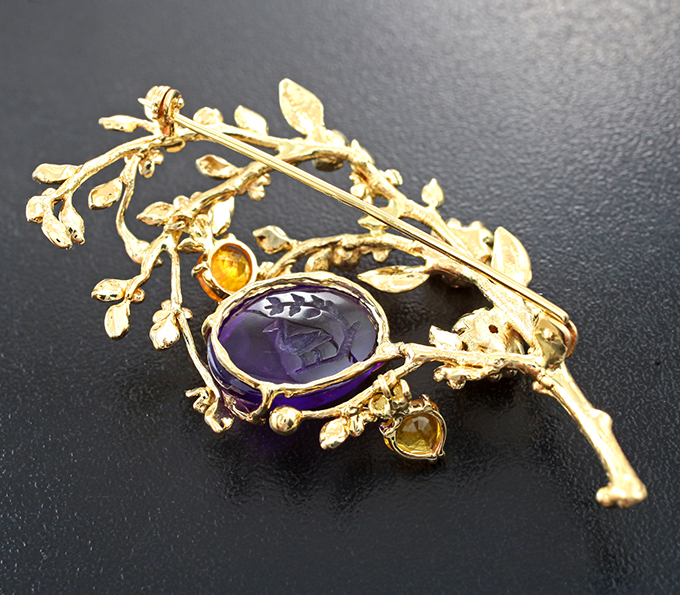 Брошь с резным аметистом 11,6 карата, цветными сапфирами и бриллиантами