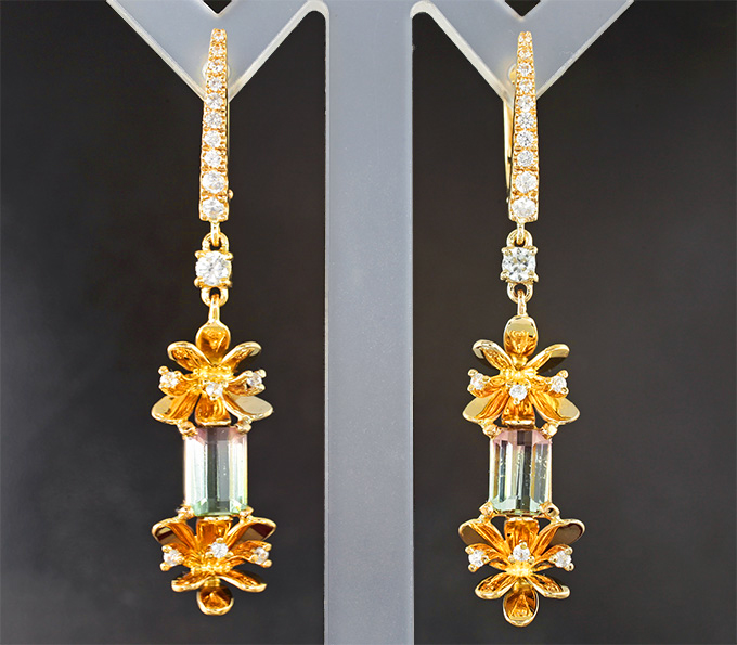 Вашему вниманию предлагаются серьги из желтого золота 585 пробы с арбузными турмалинами и бесцветными цирконами! Диаметр дополнительной инкрустации от 1 мм до 3 мм. Размеры серег с петлей 53 х 11 мм. Вес пары 9,23 г. Ниже приводятся ювелирные характеристики вставок.
