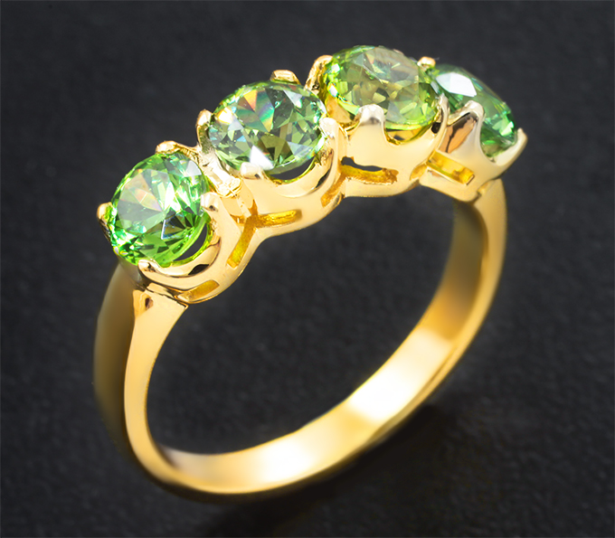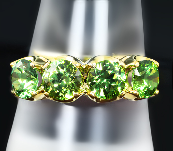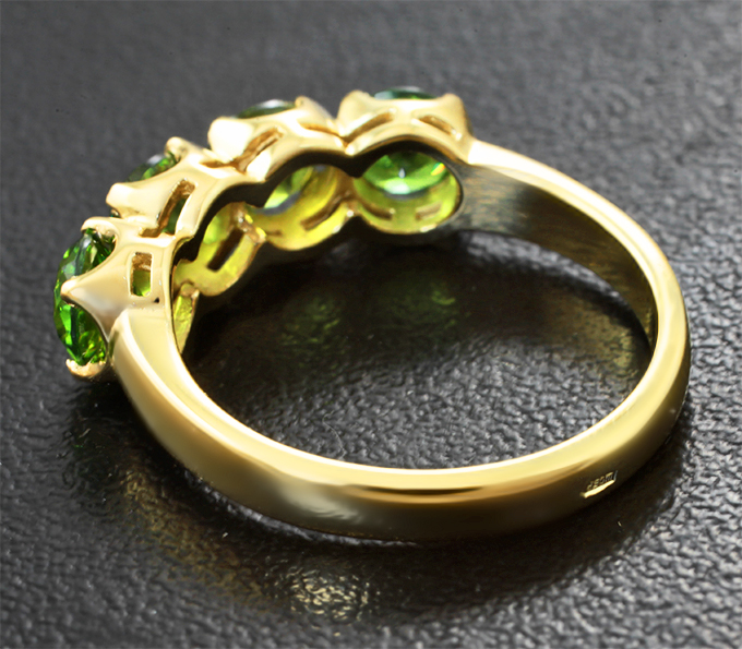 Вашему вниманию предлагается кольцо из желтого золота 585 пробы c уральскими демантоидами 2,85 карата! Диаметр вставок 5 мм. Площадка 20 х 6 мм, высота 5 мм. Вес изделия 4,94 г. Размер 18,5. Ниже приводятся ювелирные характеристики вставок.