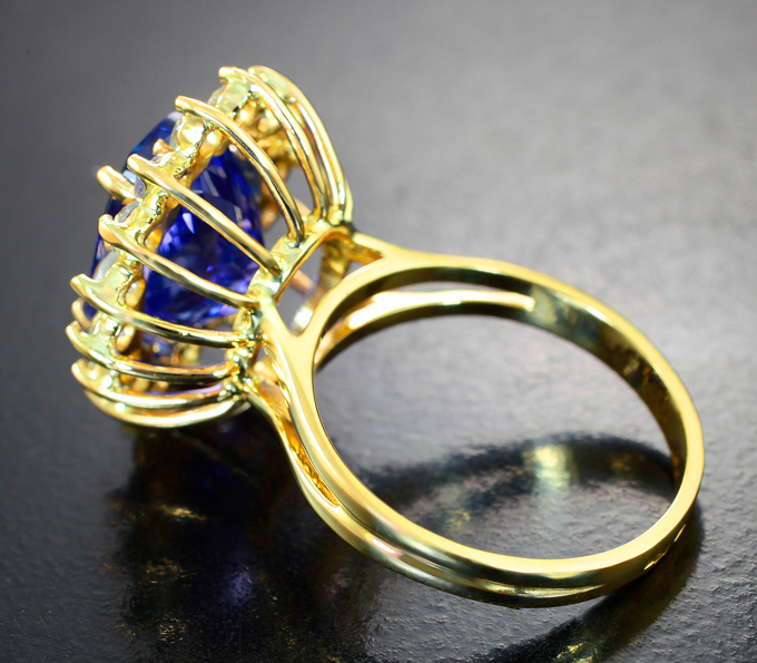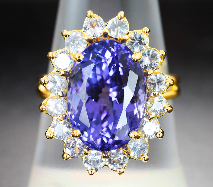Вашему вниманию предлагается кольцо из желтого золота 585 пробы с чистейшим танзанитом и бесцветными цирконами! Диаметр дополнительной инкрустации 3 мм. Площадка 20 х 16 мм, высота 13 мм. Вес изделия 6,48 г. Размер 18. Ниже приводятся ювелирные характеристики вставки.