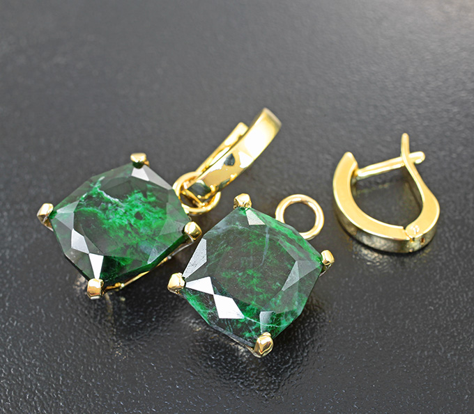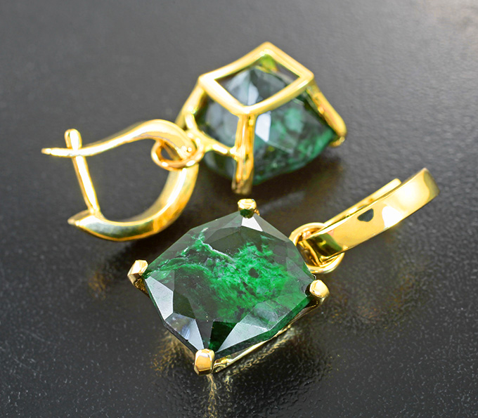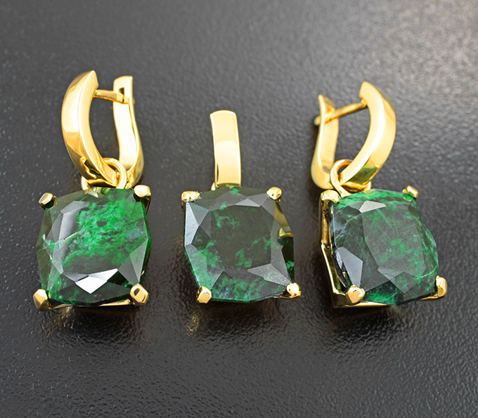 Вашему вниманию предлагается комплект (серьги + кулон) из желтого золота 585 пробы с ограненным мау-сит-ситом! Размеры вставок 15 х 14 мм и 16 х 14 мм. Вес комплекта 19,97 г.