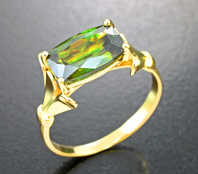Вашему вниманию предлагается кольцо из желтого золота 585 пробы с зеленым сфеном высокой дисперсии! Площадка 13 х 10 мм, высота 6 мм. Вес изделия 3,42 г. Размер 18,5. Ниже приводятся ювелирные характеристики вставки.