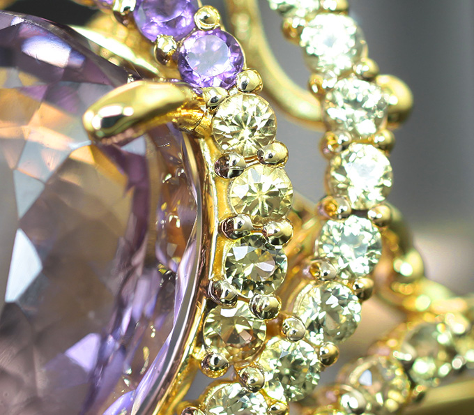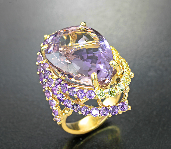 Кольцо с чистейшим аметрином 16,36 карата, аметистами и желтыми сапфирами