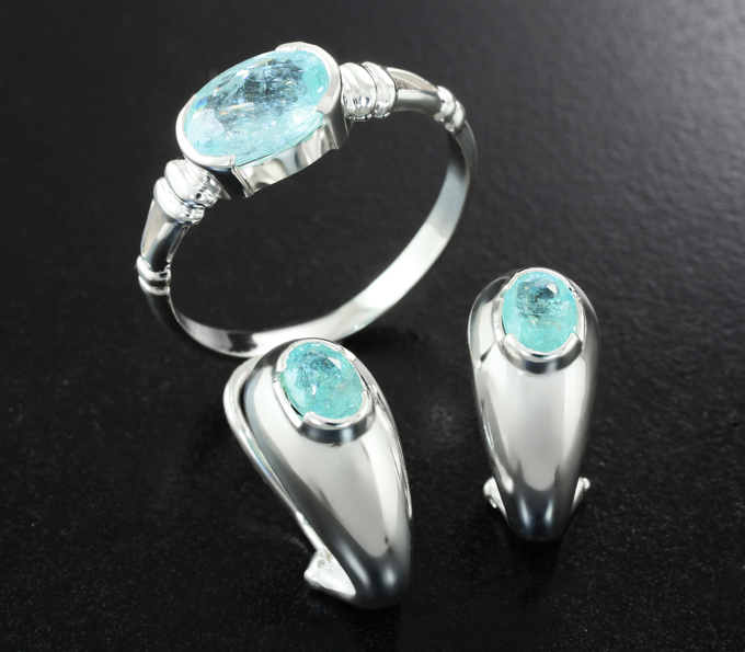 Вашему вниманию предлагается комплект (кольцо + серьги) из стерлингового серебра (925 проба) с параиба турмалинами 1,97 карата! Размеры вставок 8 х 6 мм. Вес комплекта 4,93 г.