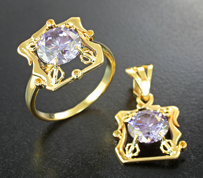 Вашему вниманию предлагается комплект (кольцо + кулон) из желтого золота 585 пробы с муассанитами! Вес комплекта 6,81 г.