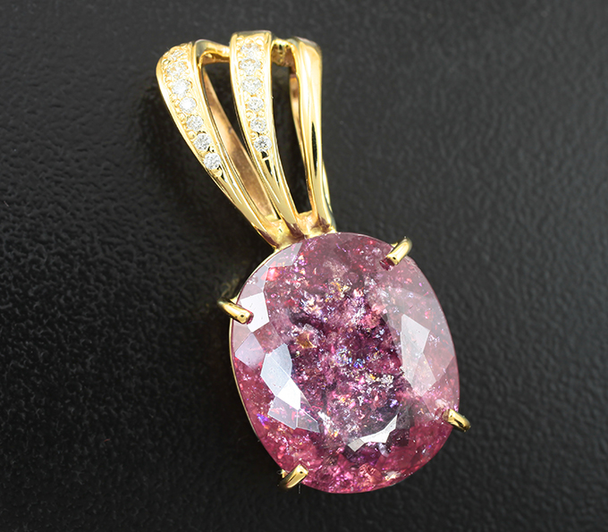 Кулон с крупным розовым турмалином с включениями меди 12,73 карата и бриллиантами
