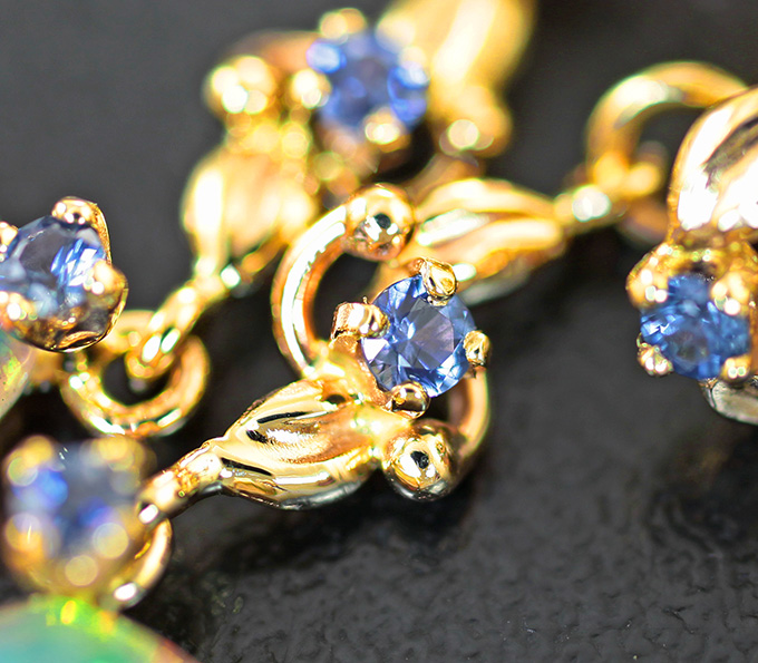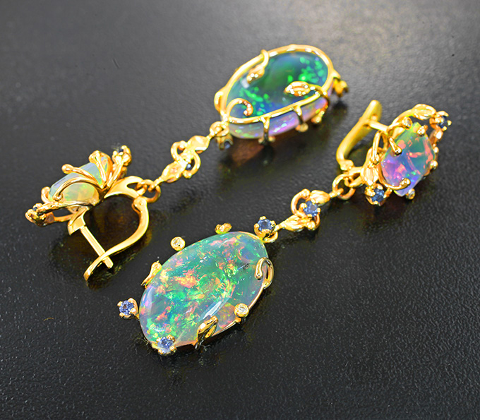 Вашему вниманию предлагаются серьги из желтого золота 585 пробы с кристаллическими эфиопскими опалами 19,98 карата, сапфирами и бриллиантами! Основные цвета опалесценции: красный, желтый, зеленый и синий. Размеры вставок от 1,3 мм до 23 х 15 мм. Размеры серег с петлей 57 х 16 мм. Вес пары 13,47 г.