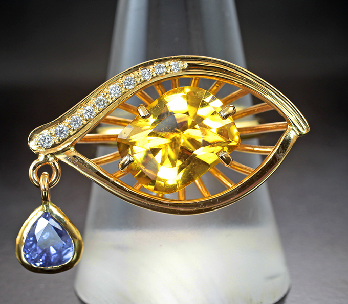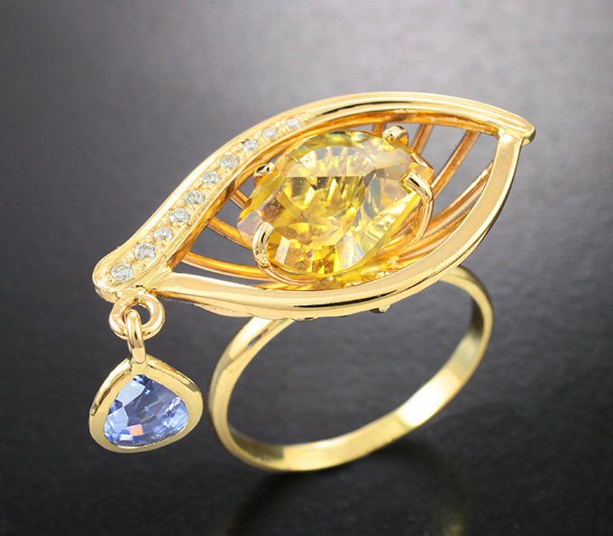 Кольцо с гелиодором 3,46 карата, синим сапфиром и бриллиантами