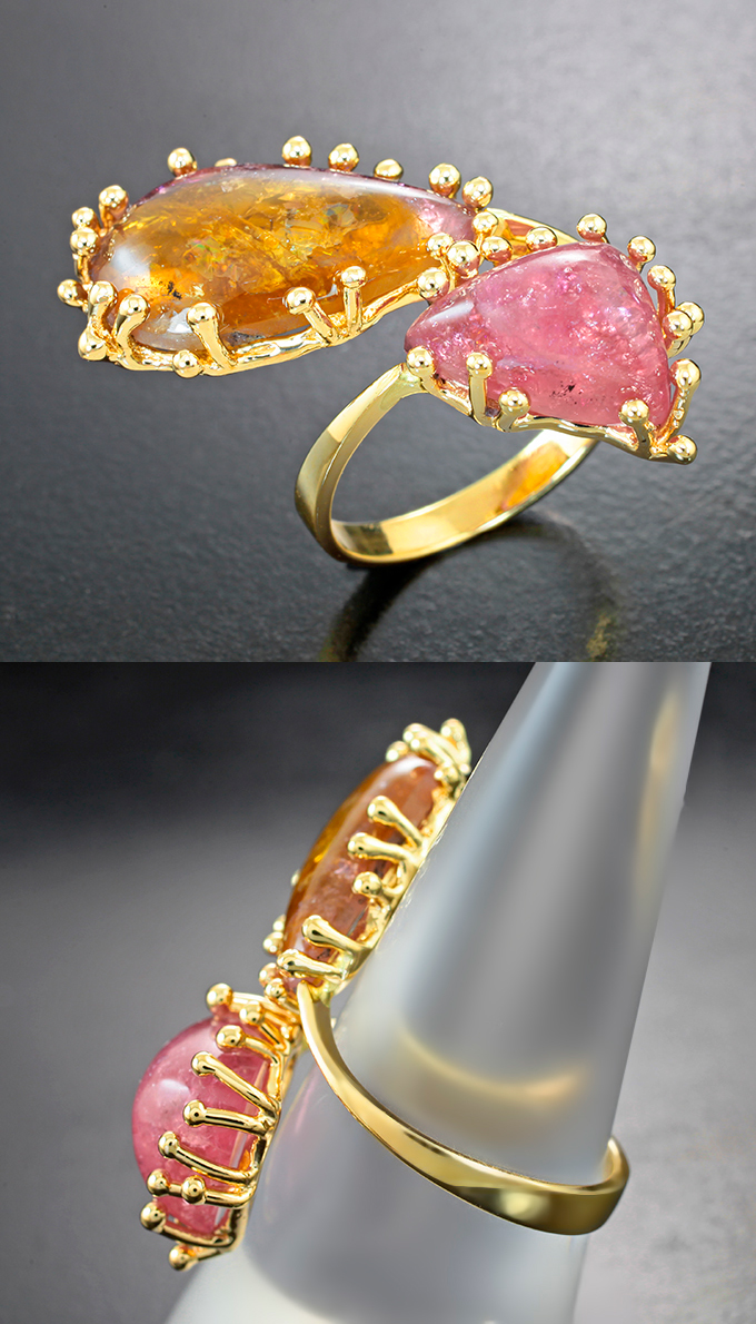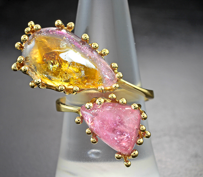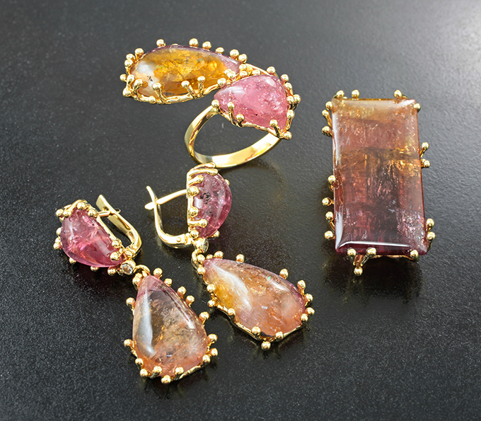 Вашему вниманию предлагается комплект (кольцо + серьги + кулон) из желтого золота 585 пробы с полихромными забайкальскими турмалинами и сапфирами! Диаметр дополнительной инкрустации 2 мм. Вес комплекта 28,58 г.