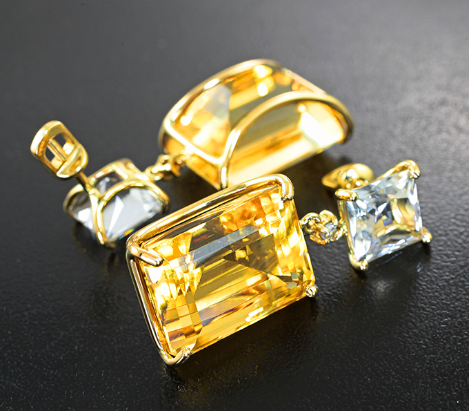 Вашему вниманию предлагаются серьги из желтого золота 585 пробы с цитринами 48,15 карата, бесцветными топазами и цирконами! Рамзеры вставок от 2 мм до 18 х 13 мм. Площадка серег 36 х 14 мм. Вес пары 16,87 г.