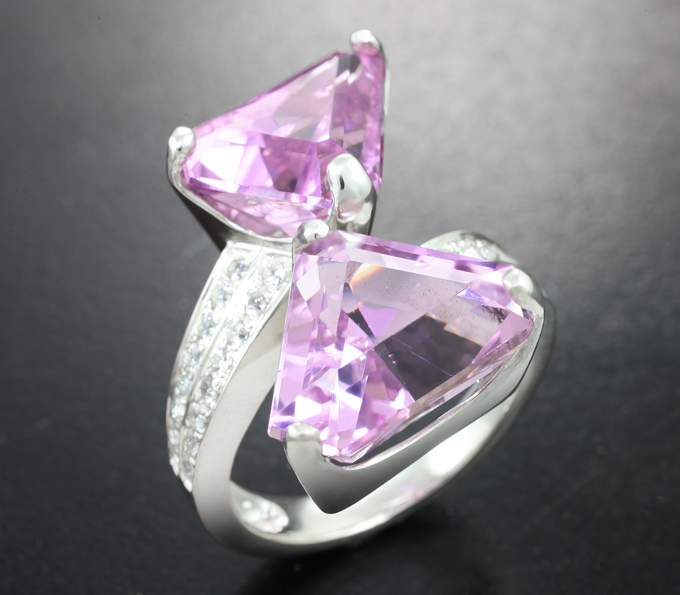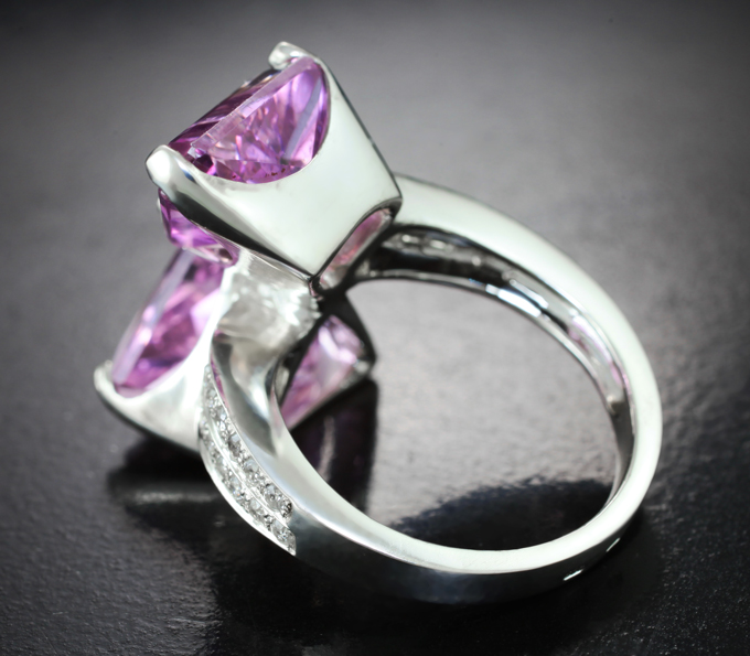 Кольцо с кунцитами авторской огранки 18,49 карата и бесцветными цирконами