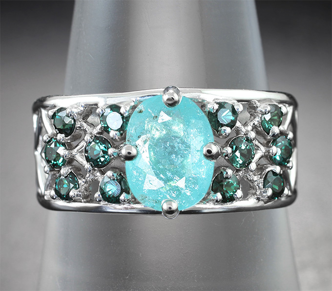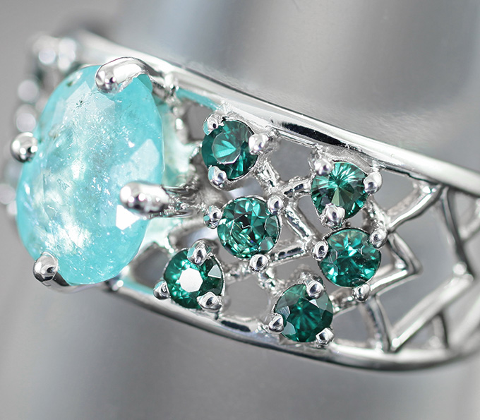 Кольцо с параиба турмалином 1,13 карата и гранатами со сменой цвета