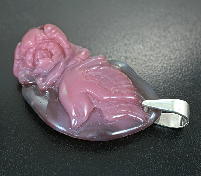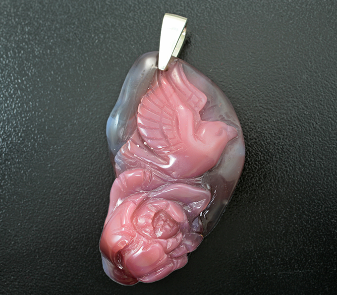 Вашему вниманию предлагается замечательный образец камнерезного искусства – миниатюра-подвеска «Утро в саду» из цельного халцедона с серебряной петлей! Ручная работа! Не подвергалась окрашиванию. Размеры 57 х 29 х 13 мм. Вес 21 г.