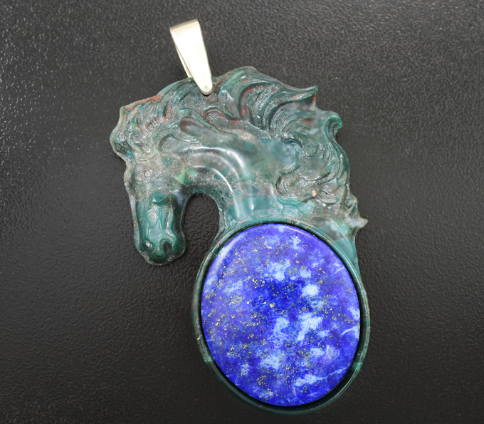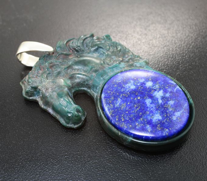 Камея-подвеска «Скакун» из цельного лазурита в резной яшме