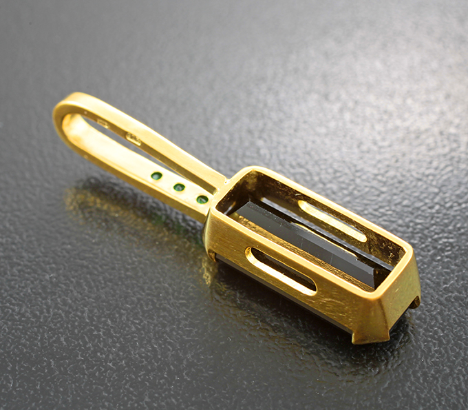 Вашему вниманию предлагается кулон из стерлингового серебра (925 проба) с шерлом и цаворитами гранатами! Изделие позолочено. Диаметр дополнительной инкрустации 2 мм. Размеры кулона с петлей 35 х 8 мм. Вес изделия 3,3 г. Ниже приводятся ювелирные характеристики вставки.