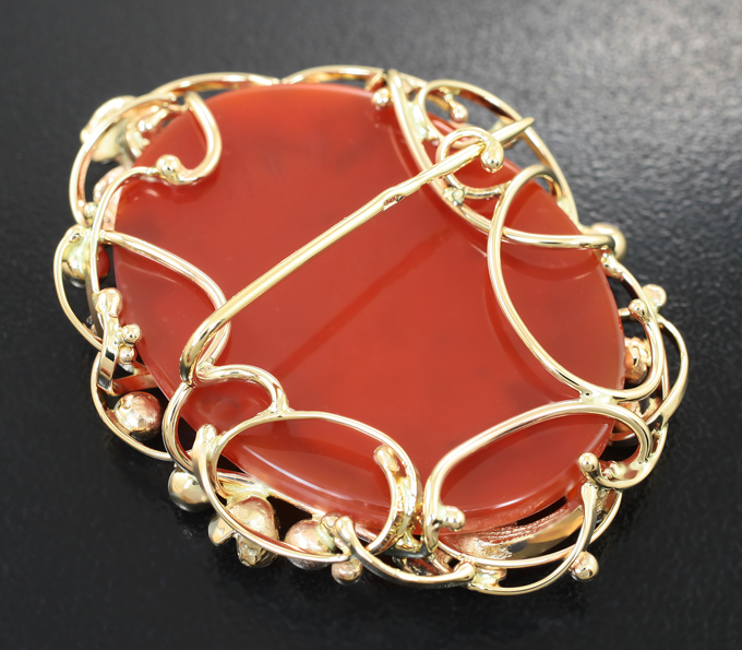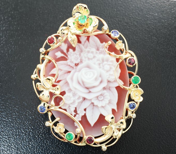 Брошь с агатовой камей на карнелиане 24,61 карата, синими и красными сапфирами, изумрудами и бриллиантами