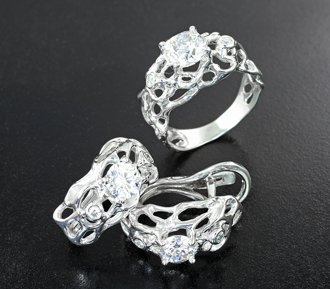 Вашему вниманию предлагается комплект (кольцо + серьги) из стерлингового серебра (925 проба) с бесцветными муассанитами! Вес комплекта 9,69 г.