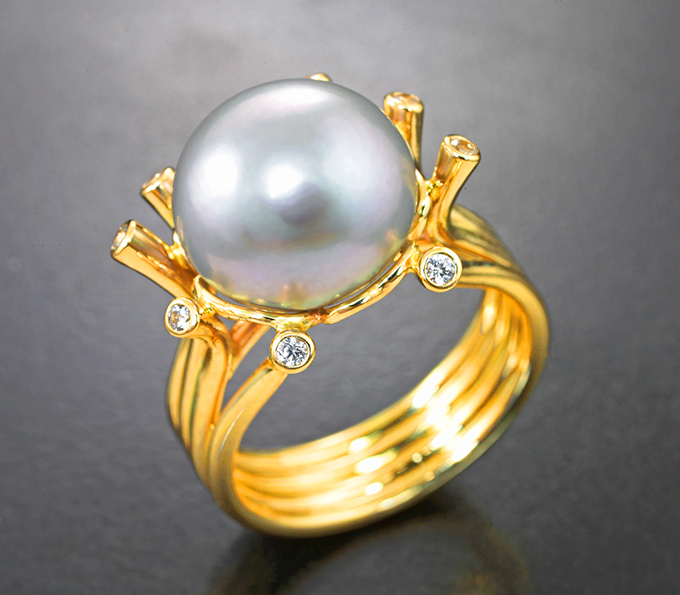 Вашему вниманию предлагается кольцо из желтого золота 585 пробы с серебристой морской жемчужиной! Диаметр дополнительной инкрустации 1,5 мм. Площадка 17 х 16 мм, высота 12 мм. Вес изделия 8,75 г. Размер 17,75. Ниже приводятся ювелирные характеристики вставки.