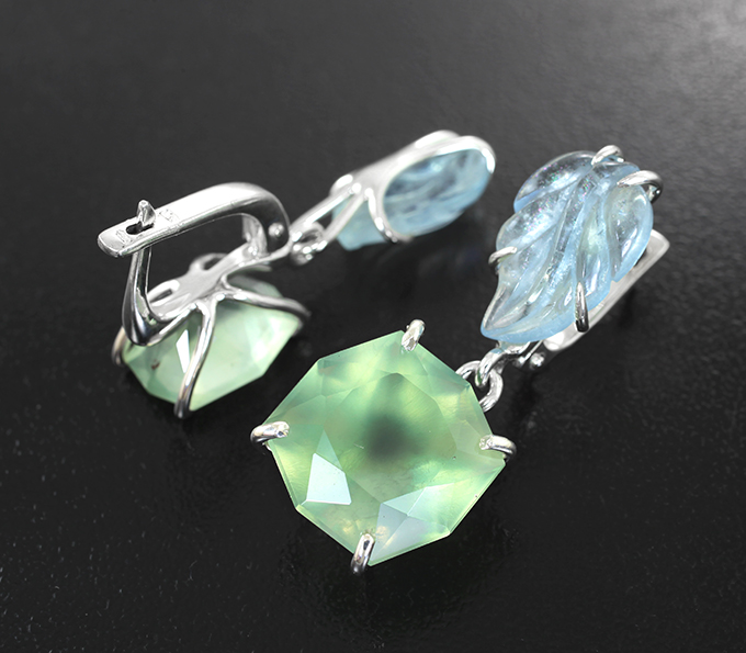 Вашему вниманию предлагается комплект (серьги + кулон) из стерлингового серебра (925 проба) с пренитом авторской огранки и резными аквамаринами! Вес комплекта 16,65 г.