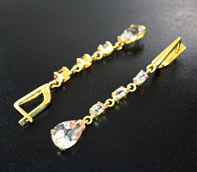 Вашему вниманию предлагаются серьги из желтого золота 585 пробы с морганитами! Размеры серег с петлей 55 х 8 мм. Вес пары 6,36 г. Ниже приводятся ювелирные характеристики вставок.
