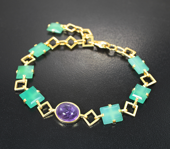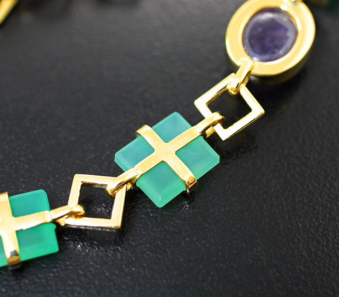 Вашему вниманию предлагается браслет из желтого золота 585 пробы с хакманитом и хризопразом! Длина браслета регулируемая от 165 мм до 195 мм, ширина 10 мм. Вес изделия 11,82 г. Ниже приводятся ювелирные характеристики вставок.