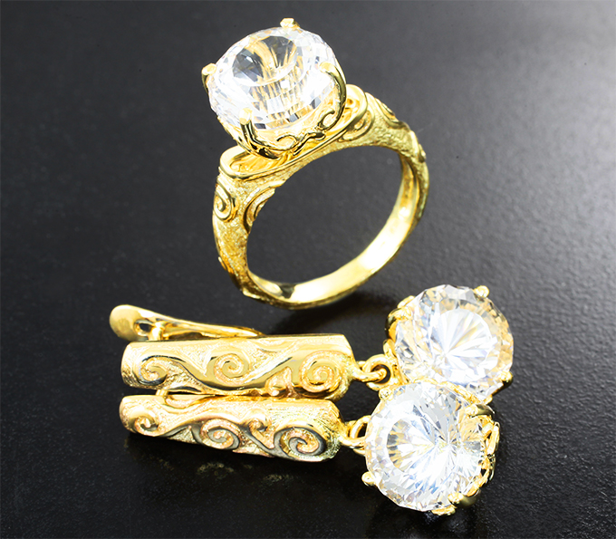 Вашему вниманию предлагается комплект (кольцо + серьги) из желтого золота 585 пробы с данбуритом! Вес комплекта 16,37 г.