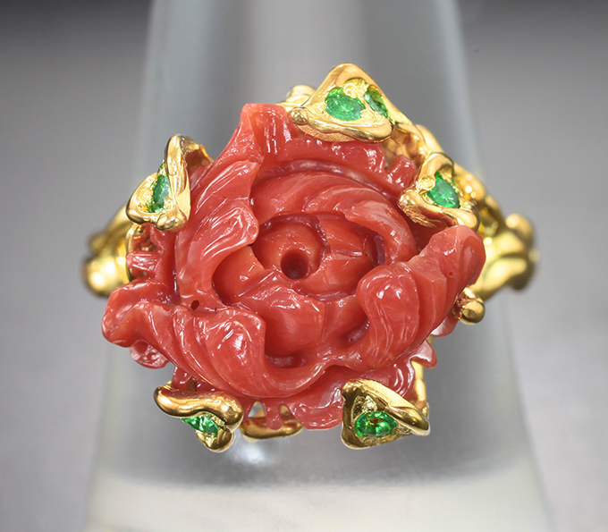 Кольцо с резным кораллом 6,12 карата и цаворитами