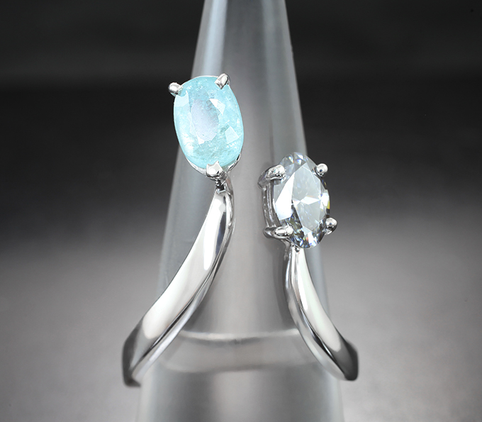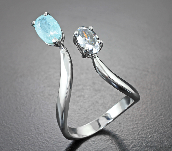 Кольцо с чистейшим платиновым муассанитом топовой огранки 0,86 карата и параиба турмалином 1,13 карата