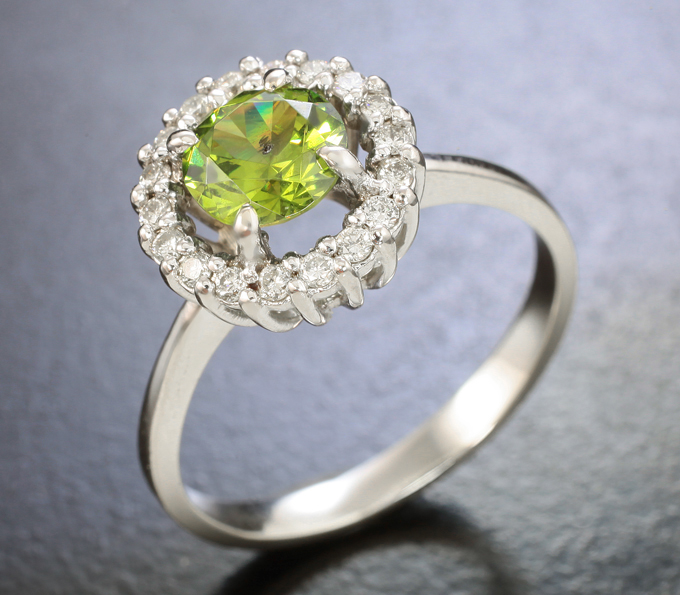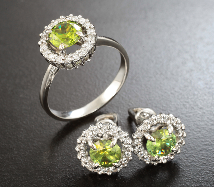 Вашему вниманию предлагается комплект (кольцо + пусеты) из белого золота 585 пробы с демантоидами гранатами и бриллиантами! Вес комплекта 6,38 г.
