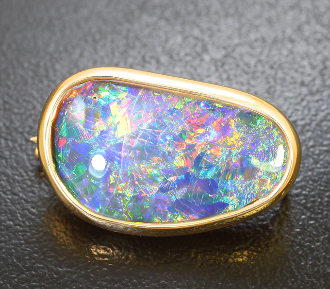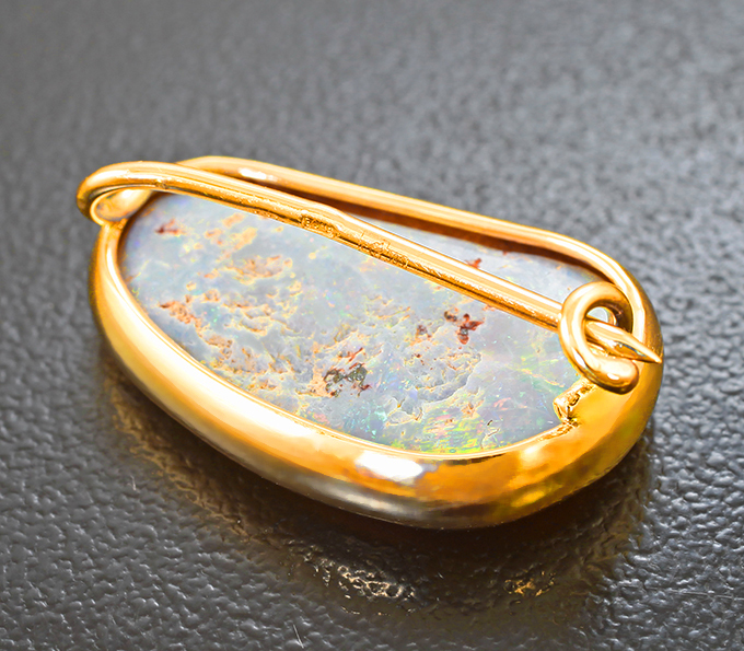 Вашему вниманию предлагается брошь из желтого золота 585 пробы с австралийским solid опалом! Основные цвета опалесценции: красный, желтый, зеленый, синий и фиолетовый. Площадка 22 х 13 мм. Вес изделия 3,2 г. Ниже приводятся ювелирные характеристики вставки.