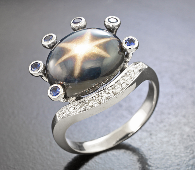 Кольцо с крупным звездчатым сапфиром 13,5 карата, синими сапфирами и бриллиантами