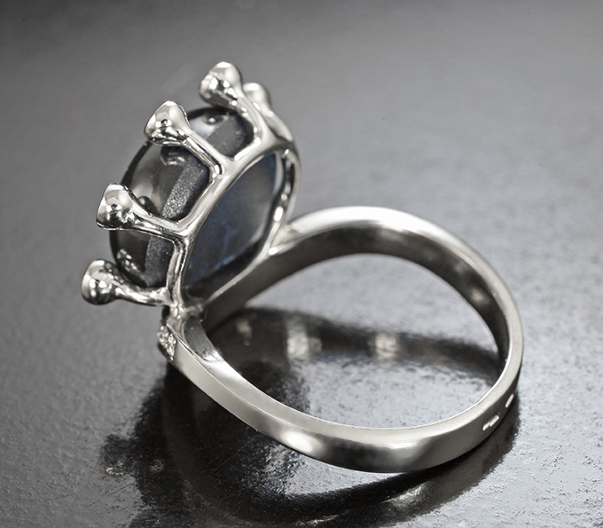 Вашему вниманию предлагается кольцо из белого золота 585 пробы с крупным звездчатым сапфиром, синими сапфирами и бриллиантами! Диаметр дополнительной инкрустации от 1,1 мм до 2 мм. Площадка 18 х 17 мм, высота 7 мм. Вес изделия 7,84 г. Размер 18,5. Ниже приводятся ювелирные характеристики вставки.